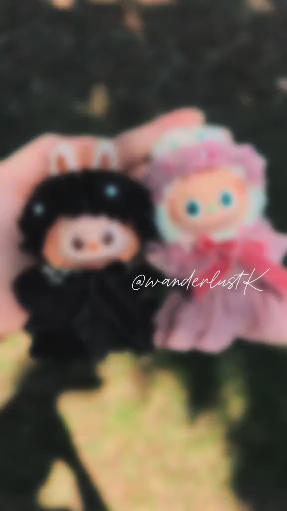 Wrap your beloved Lbb doll in the magic of twilight with the Enchanted Dusk dress. Designed with delicate black lace, soft faux fur trim, and a velvet bow, this outfit captures the romance of dusk when day meets night. Tiny pearl accents and shimmering details add a touch of mystery, making your Labubu look both elegant and enchanting.
